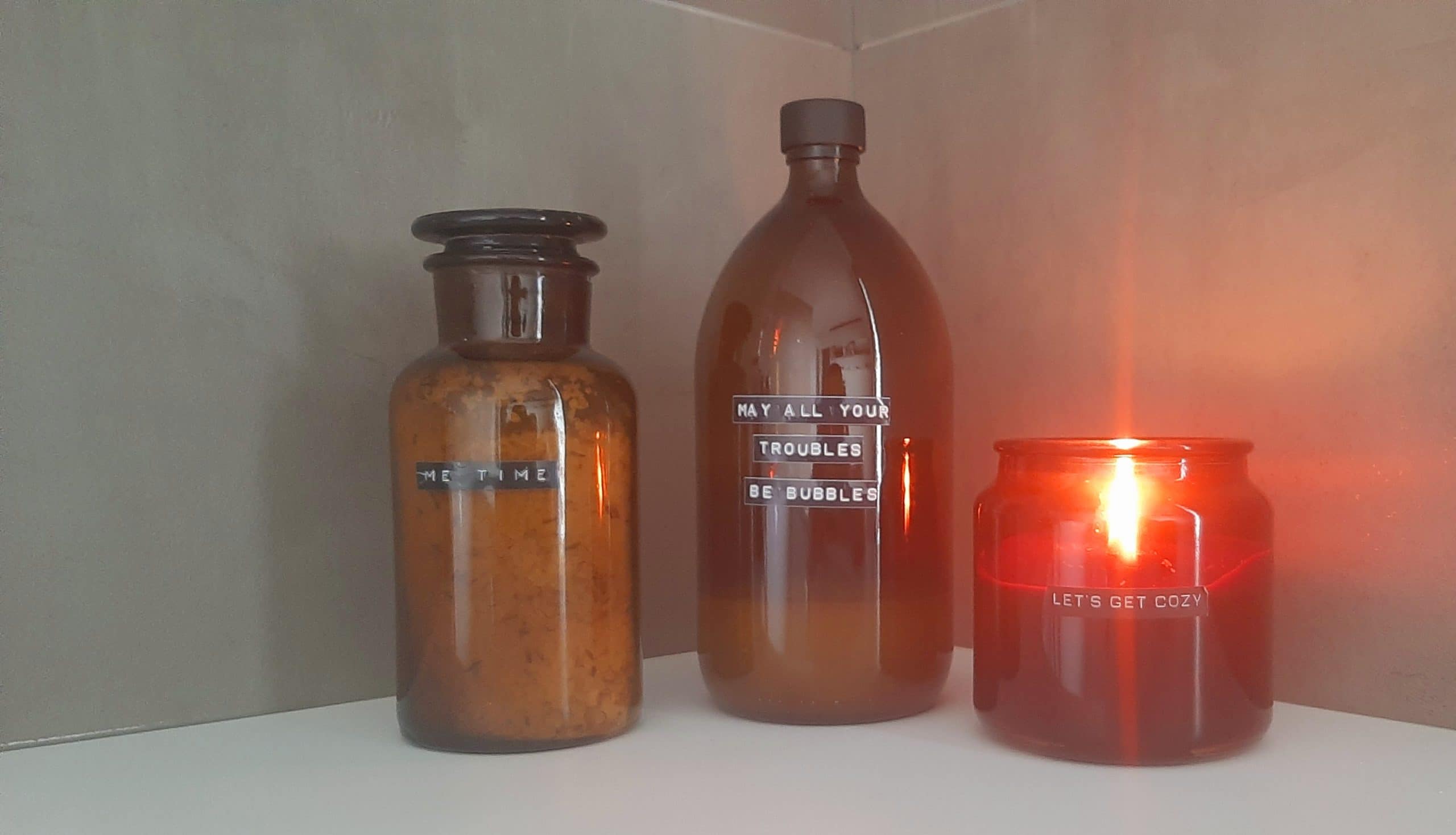 Ik ben alvast heel blij met het resultaat :-) Met een letterpons heb ik wat leuke spreuken opgezocht en iedere flacon/fles wat opgeleukt, natuurlijk kon een heerlijke geurkaars niet ontbreken om het geheel af te maken: