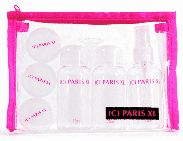 Vorige week kocht ik een handig setje bij Ici Paris XL. Een leuk transparant tasje met mini plastieken potjes en flaconnetjes. Deze kan je dan vullen met je favoriete bodylotion, dagcrème, shampoo, make-up, noem maar op.