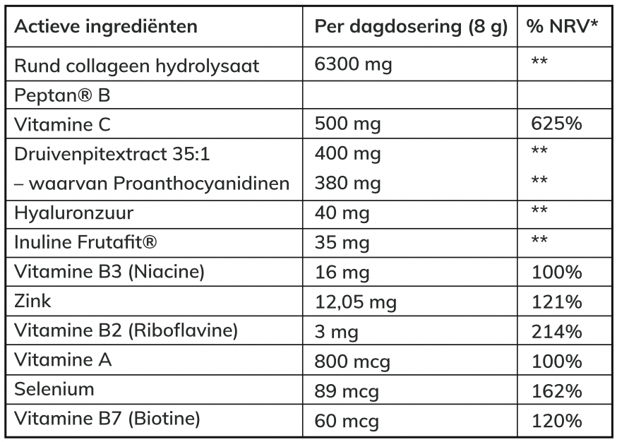 Premium rundercollageen, verrijkt met vitamine C, druivenpit extract, hyaluronzuur, inuline, vitamine B3 (niacine), zink, vitamine B2 (riboflavine), vitamine A, selenium en vitamine B7 (biotine)