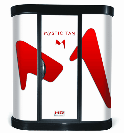 De volautomatische Mystic Tan Cabine is een soort van douchecabine met een spraykop die op en neer en van onder naar boven glijdt en daaruit het op natuurlijke ingrediënten gebaseerde bruiningsmiddel vernevelt.