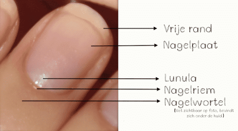 Als je niet helemaal begrijpt wat ik bedoel, kijk dan even naar deze afbeelding (afkomstig van deze website) van de anatomie van de nagel. Hier zie je meteen wat er bedoeld wordt met nagelriem en nagelwortel:
